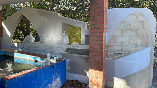 Mural en el patio del CEIP MÓNICA PONT de Bufali. Su extensión es de 6 metros por 2 de alto.